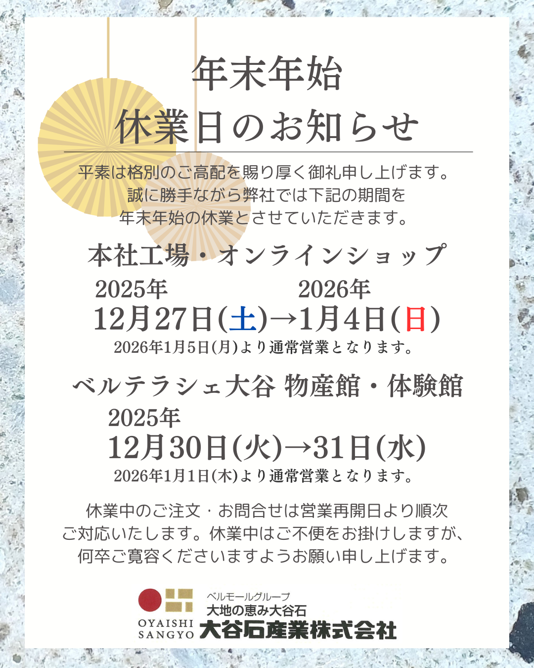【大谷石産業オンラインショップ休業日】